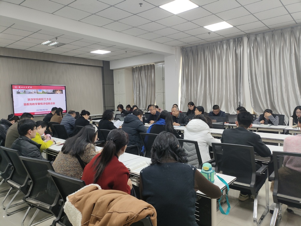 为扎实推进教育教学审核评估工作,明确任务目标,凝聚全院合力,2025年2月27日下午,旅游学院在党员活动室召开全体教职工大会暨教育教学审核评估推进会。会议由学院党总支书记刘锐主持,全体教职工参会。